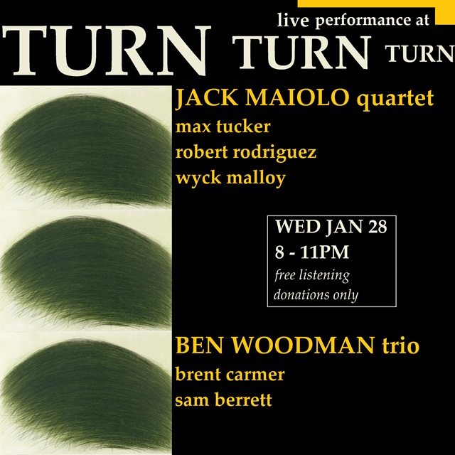You might remember Ben from his performance at Turn! for the CMG Improv Summit. He’s back, this time with a trio of jazz cats doing something different! Guitarist Jack Maiolo joins what should be an excellent night of adventurous sound!