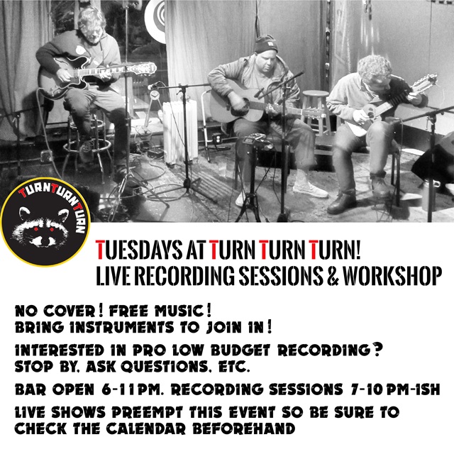 Stop by Turn Turn Turn! and shake off those post Groundhog’s Day blues with some free music and an open jam for our next recording session / workshop. Guitar whiz Jake Soffer will be laying down some potential tracks for his next solo album from 7-8:30 then open recording, etc. until 10pm. Bar open 6-11pm.